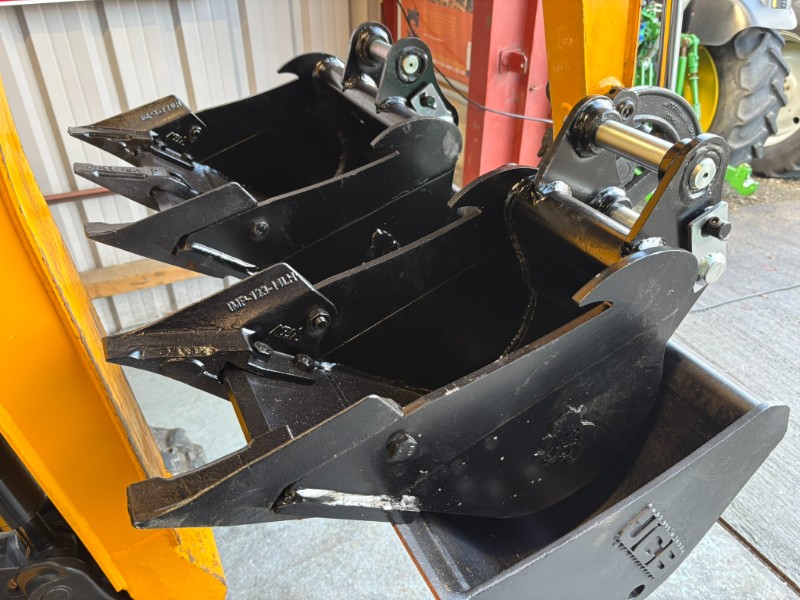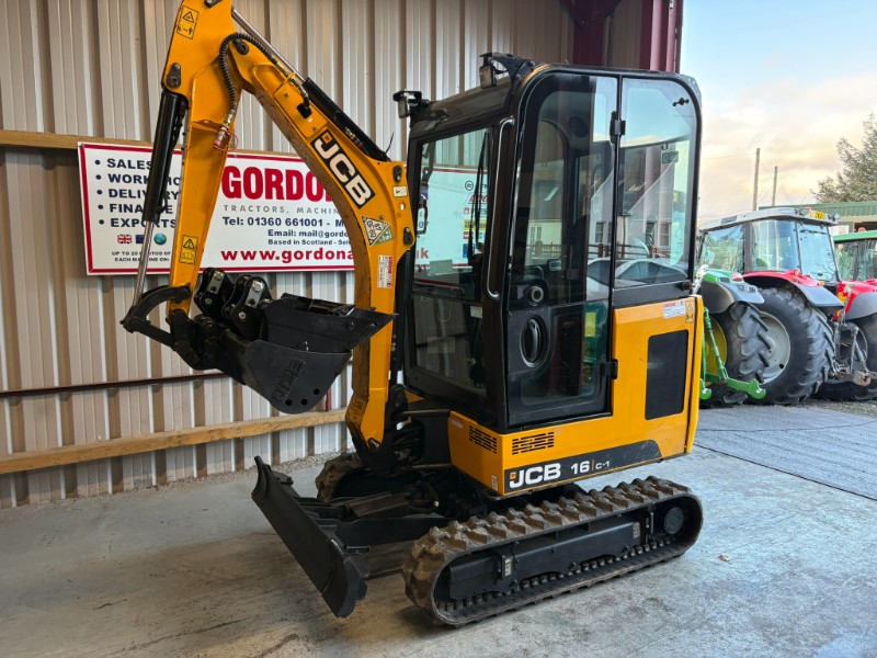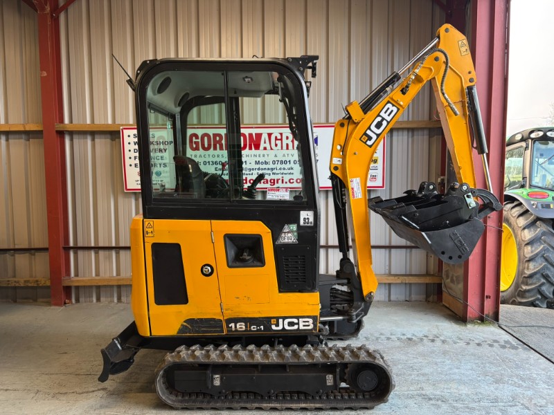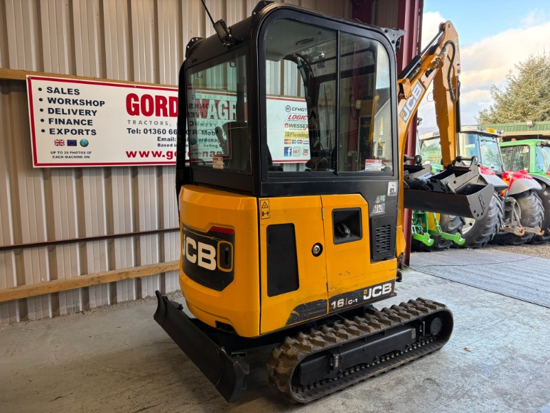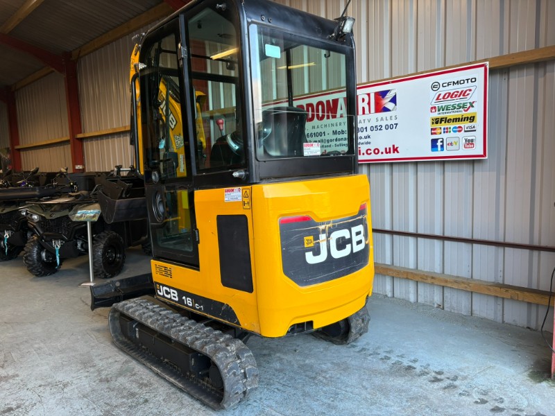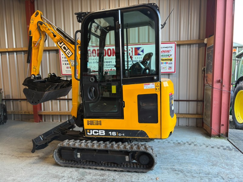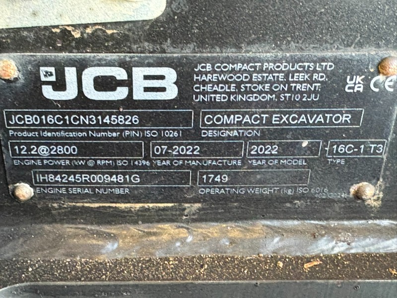 JCB 16C-1 Mini Excavator, 2022, 1.6 Ton, c/w 3 buckets (2 are brand new), expanding tracks, 2 speed tracking, rubber tracks 80%, dozer blade with side extensions, slew, piped for breaker, only 493 recorded hours, work lamps, window wiper, cab heater. Good spec machine ready to go to work. All prices are plus VAT.