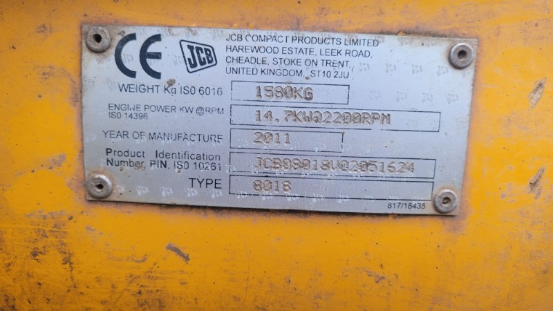 JCB 8018 Mini Excavator, 2011, 1.8 Ton, c/w 2 buckets, rubber tracks 80%, dozer blade, slew, piped for breaker. The door window is Perspex, rusty cab and dipper arm can be slow. Therefore the excavator is being sold not through our workshop, not serviced, sold as seen with no warranty. It will be the responsibility of the purchaser to complete any service or repair work to bring the item to a standard fit for purpose. The excavator is being offered as spares or repairs, with many of the items needing someone with experience and time to put them right. Excellent projects for all mechanical minded people. All prices are plus VAT.