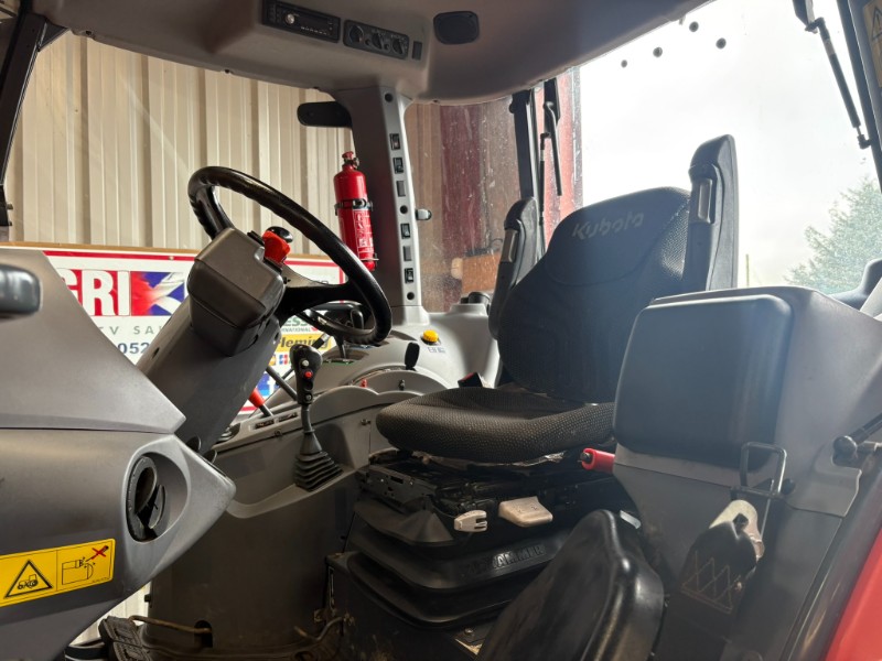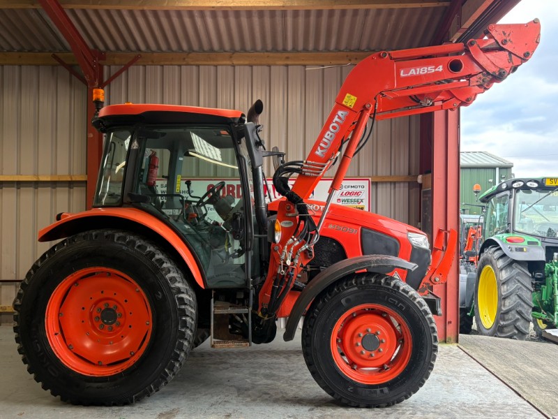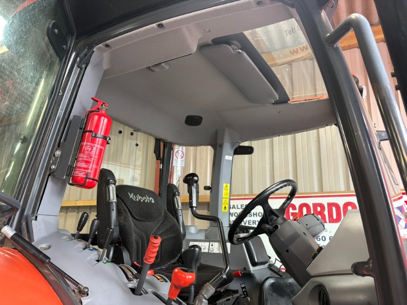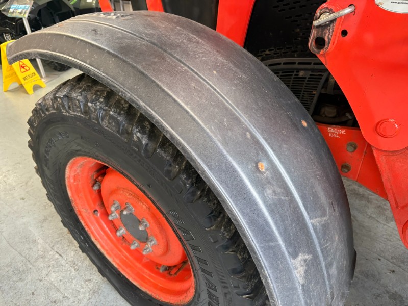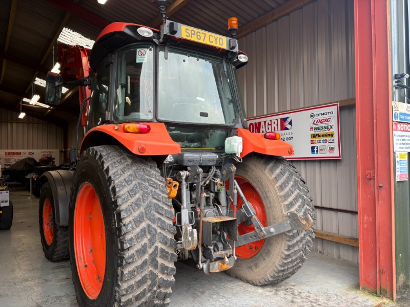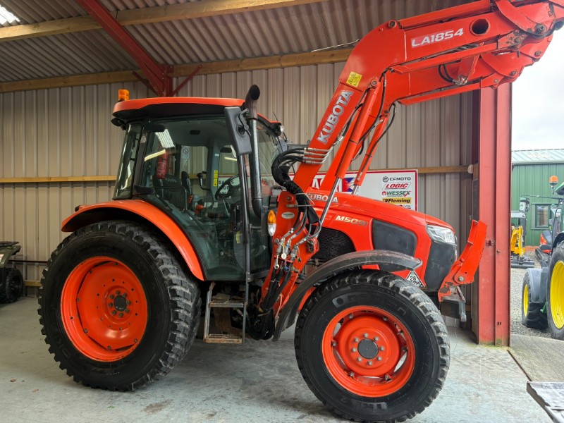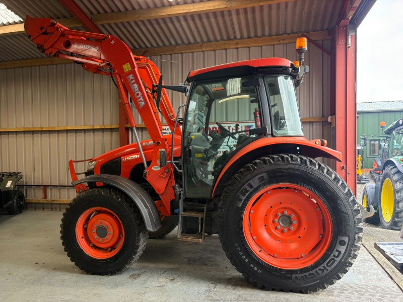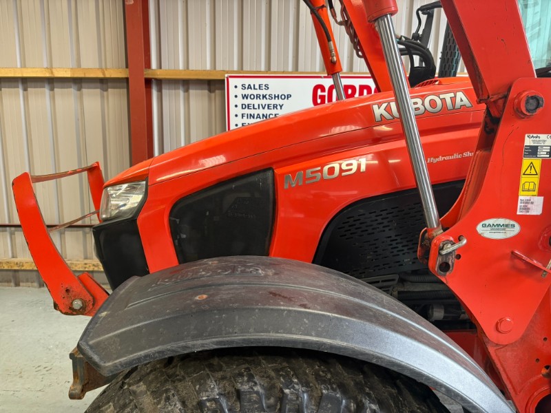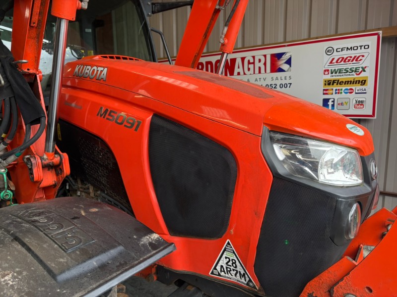 Kubota M5091 4WD Tractor, 2017, Reg: SP67 CYO, c/w Kubota LA1854 Loader, 3rd service, joystick control, 75HP, 4738 recorded hours, hydraulic shuttle, declutcher, 36 forward/reverse with max speed 40K, push out PUH, 2 spools, trailer braking valve, quick release rear link arms, front fenders. Tyre sizes and percentages 440/80x34 50% and 340/80x24 30%. Air con, air seat, passenger seat, work lamps and beacons. Ex local authority tractor in clean condition. All prices are plus VAT.