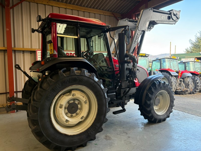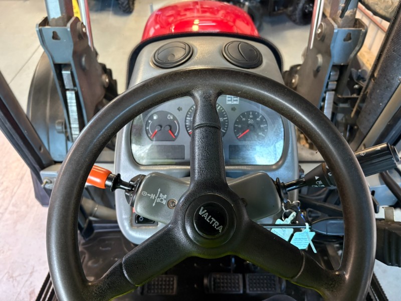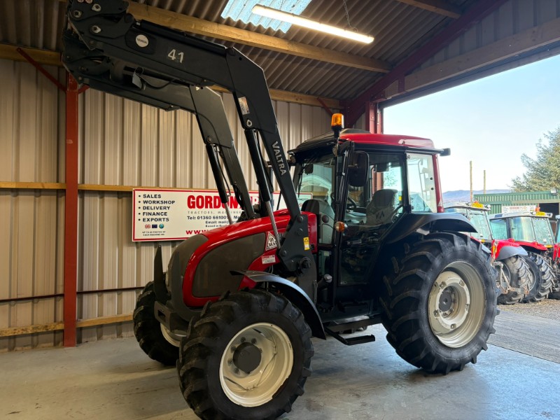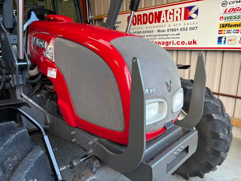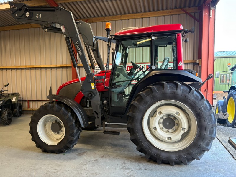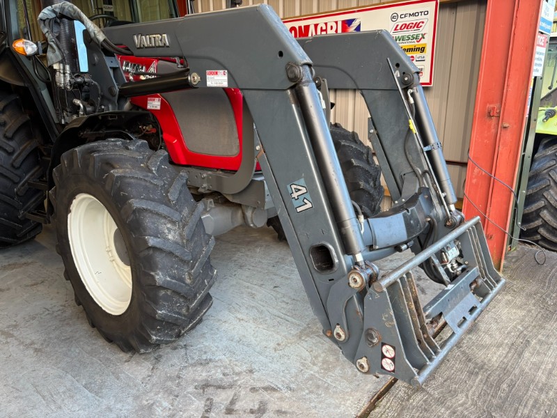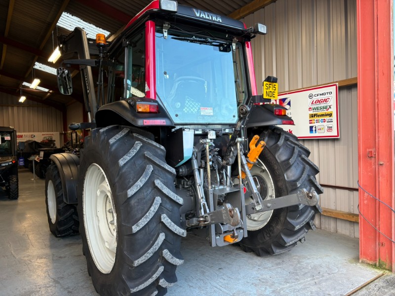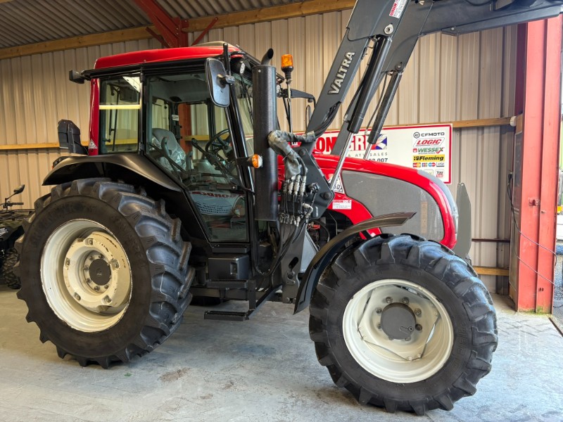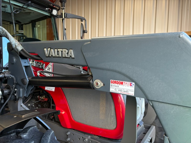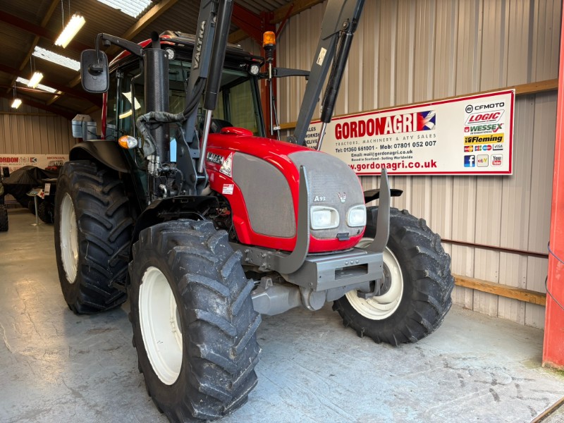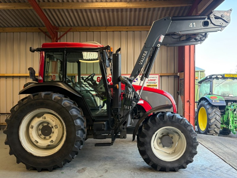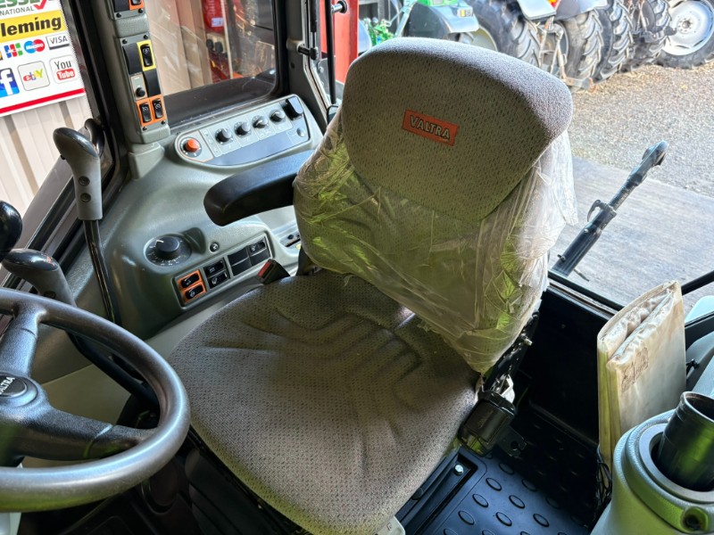 Valtra A93 4WD Tractor, 2015, Reg: SF15 NDE, c/w Valtra Alo 41 loader, joystick control, 3rd service, 100HP approx, 8885 recorded hours, 12/12 F/R Shuttle, declucther, max speed 40K, 540/1000 PTO, PUH and drawbar, 2 spools, trailer braking valve, top link, quick release rear link arms, rear wheel weights, front fenders. Tyre sizes and percentages 13.6x24 40% and 420/85x34 80%. Air con, air seat, heated seat, sunroof, work lamps and beacon. 1 owner from new with V5 document. Straight from local farm and in genuine condition. All prices are plus VAT.