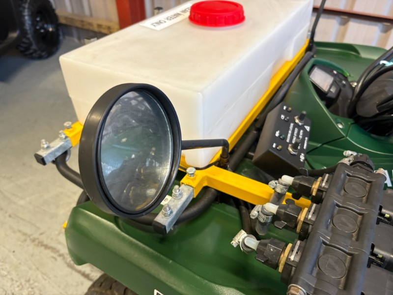 Fitted with Vale rear sprayer tank with pump, pressure control and filtration, front mounted water tank, front mounted control valves, front boom with 2 nozzles, two footrest nozzles, hand lance and hose.